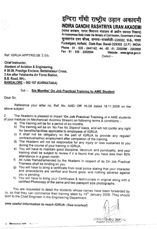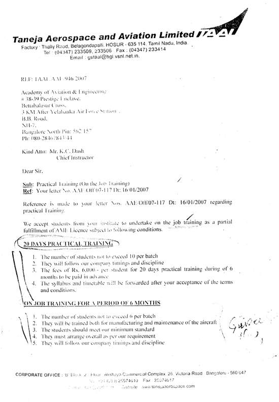 Academy of Aviation & Engineering is purely a Technical institute which is approved by Director General of Civil Aviation, (Govt. of India) for Three Years course in Aircraft Maintenance Engineering at Bangalore center.